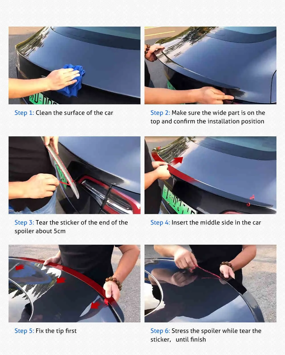 • Installation: Tesla model 3 ducktail spoiler No drilling or modifications are required; simply install with the included double-sided automotive tape. Simply peel off the 3M tape on the back and stick the spoiler to the trunk lid.