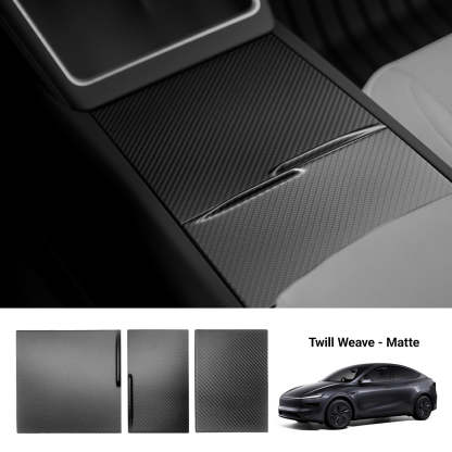 Upgrade your Tesla Model Y Juniper interior with a genuine dry carbon fiber center console cover. Precision-molded 1:1 from OEM data, this lightweight and durable overlay adds a luxurious touch while protecting your original panels from scratches and daily wear. The 3D-arched side panels hug every curve, with precision-cut edges that clear slide tracks perfectly. Pre-applied 3M automotive adhesive allows for a quick, secure installation in just 30 seconds.