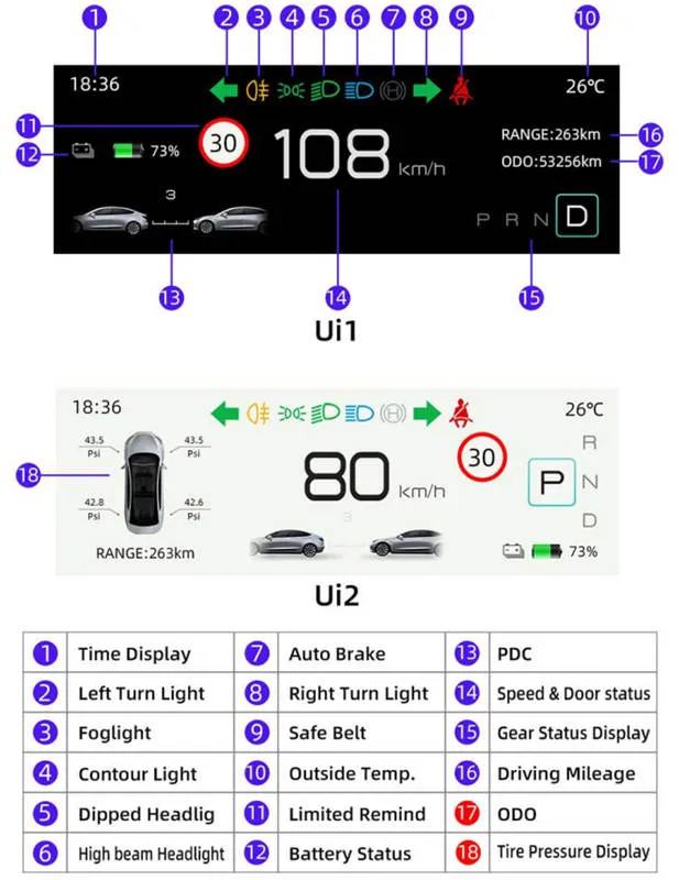 • You don't need to turn your head to the big screen on the right side while driving because this HUD syncs basically any car information you need to know, such as gear position/lights/speed/doors/safety distances/tires/seat belts, and so on.