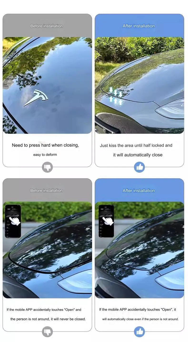 • Upgrade Functionality: Automatically engages suction to fully close the frunk once it reaches the halfway point, simplifying the closing process.